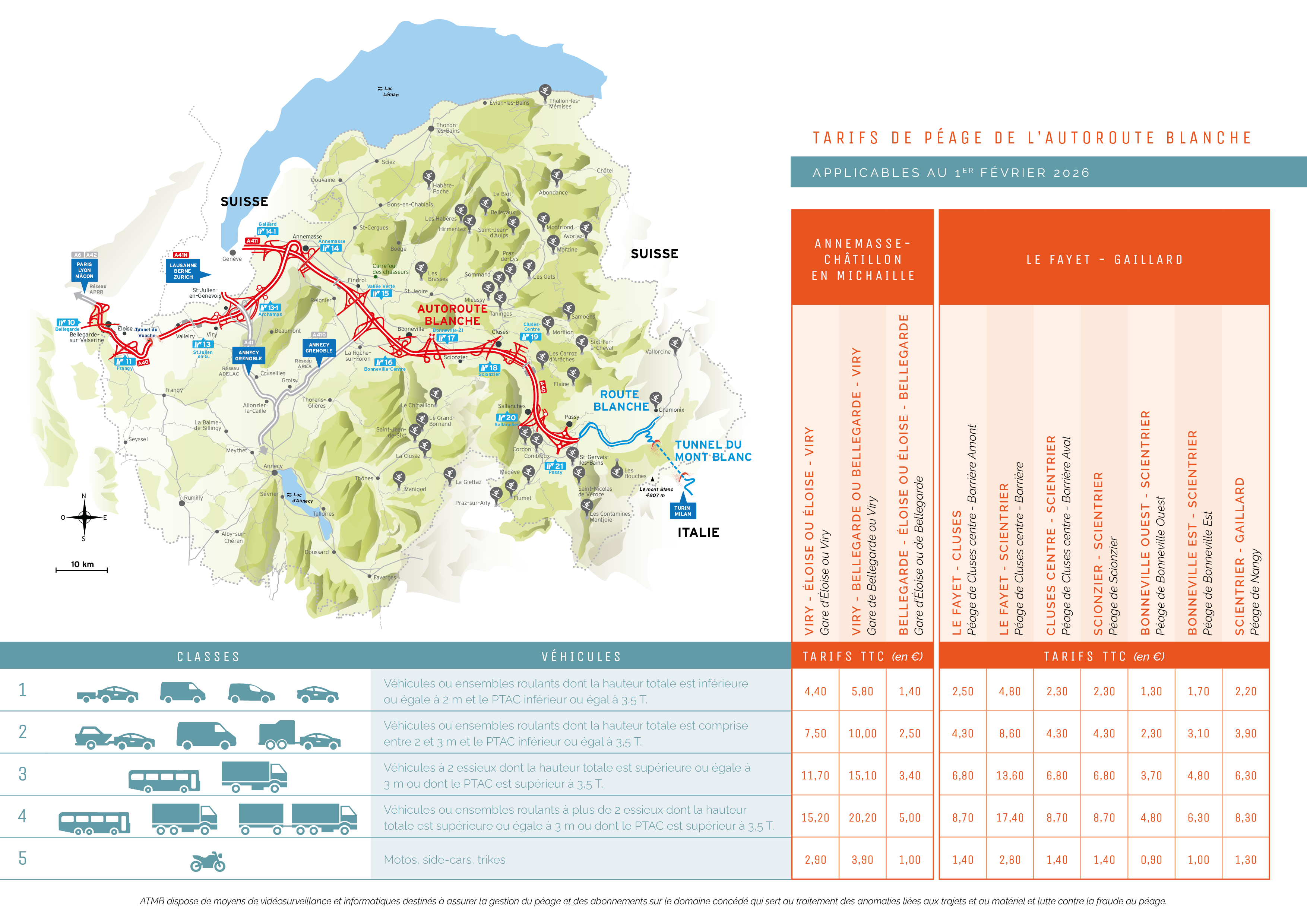 Le paiement en francs suisses n’est pas accepté. Suite à la décision d’abandonner le taux fixe de change entre Euro et Franc Suisse, ainsi qu’en raison de la difficulté d’ajuster le taux de conversion entre les deux devises en permanence, le paiement du péage du Tunnel du Mont-Blanc en Franc Suisse n’est plus accepté depuis le 1er octobre 2015.